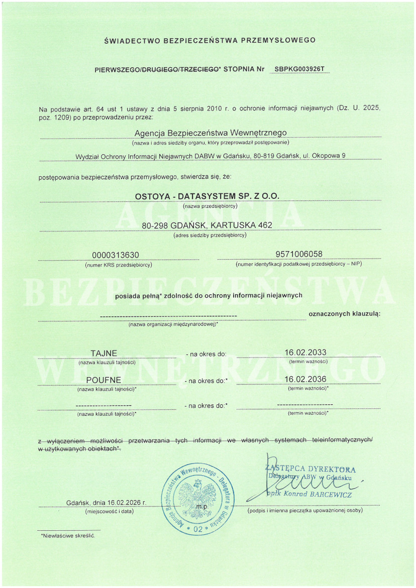 OSTOYA-DataSystem sp. z o.o. to firma z niemal trzydziestoletniem doświadczeniem w zakresie elektronicznych systemów bezpieczeństwa obiektów przemysłowych, specjalnych oraz użytkowych. Zapewniamy bezpieczeństwo ludzi, procesów, informacji i innych zasobów organizacji